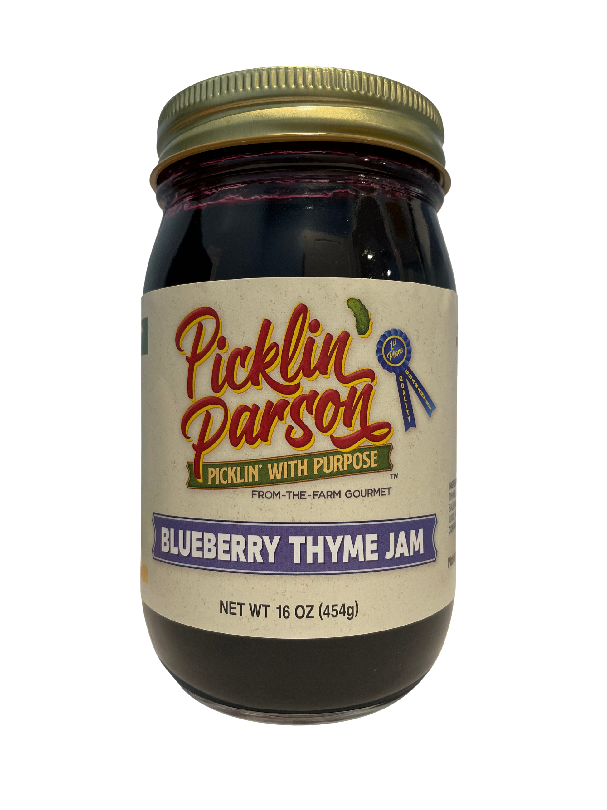 (Texas Regional State Fair Blue Ribbon winner 2021)Our berry jams feature the addition of fresh herbs that gives a savory flavor to a sweet delicacy. We use the freshest berries, picked at the peak of ripeness from East Texas that is famous for its berry patches. The deep blue color of this jam is beautiful. It was up for “best of show” at one of our state regional fairs. The judges loved it and you will too. ~Picklin’ Pars